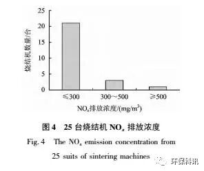 NOx来源于烧结点火阶段、固体燃料燃烧和高温反应阶段。烧结过程产生的NOx有80%~90%来源于燃料中的氮,其中90%以上为NO,5%~10%为NO2还有微量N2O。钢铁烧结工序NOx产生量为0.4~0.7kg/t,排放浓度一般为200~350mg/m3。共调研25台烧结机NOx排放浓度调研统计结果见图4。