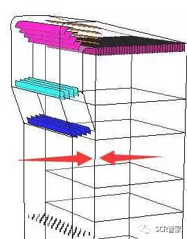3)反应器后侧顶板与整流格栅不建议留有空间,会造成反应器后侧烟气流速过高。如下图: