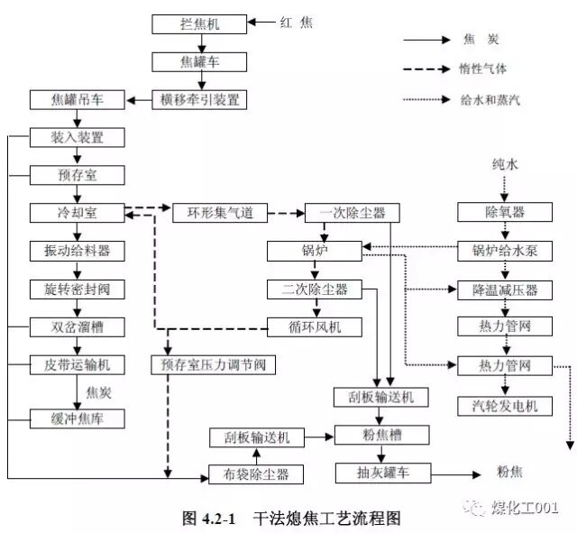干熄焦主要由干熄炉、装入装置、排焦装置、提升机、电机车及焦罐台车、焦罐、一次除尘器、二次除尘器、干熄焦锅炉单元、循环风机、除尘地面站、水处理单位、自动控制部分和发电部分等组成。